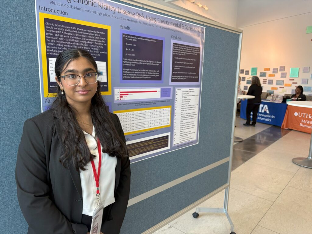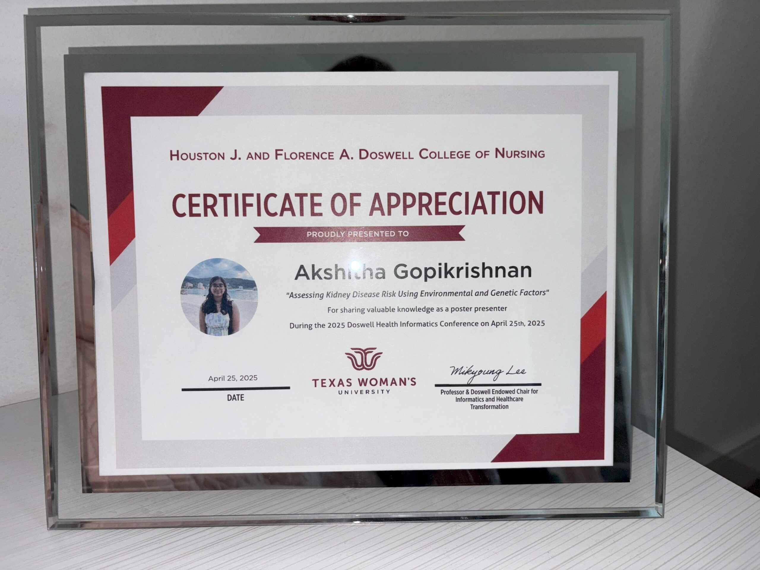 Proud to be the first high school presenter from Proper ISD to present my research on clinical strategies on “Assessing Kidney Disease Risk Using Environmental and Genetic Factors” at the Doswell Health Informatics Conference, April 2025, held at Texas Woman’s University & HIMSS, focused on enhancing patient predictive care and outcomes. Apr 2025.
