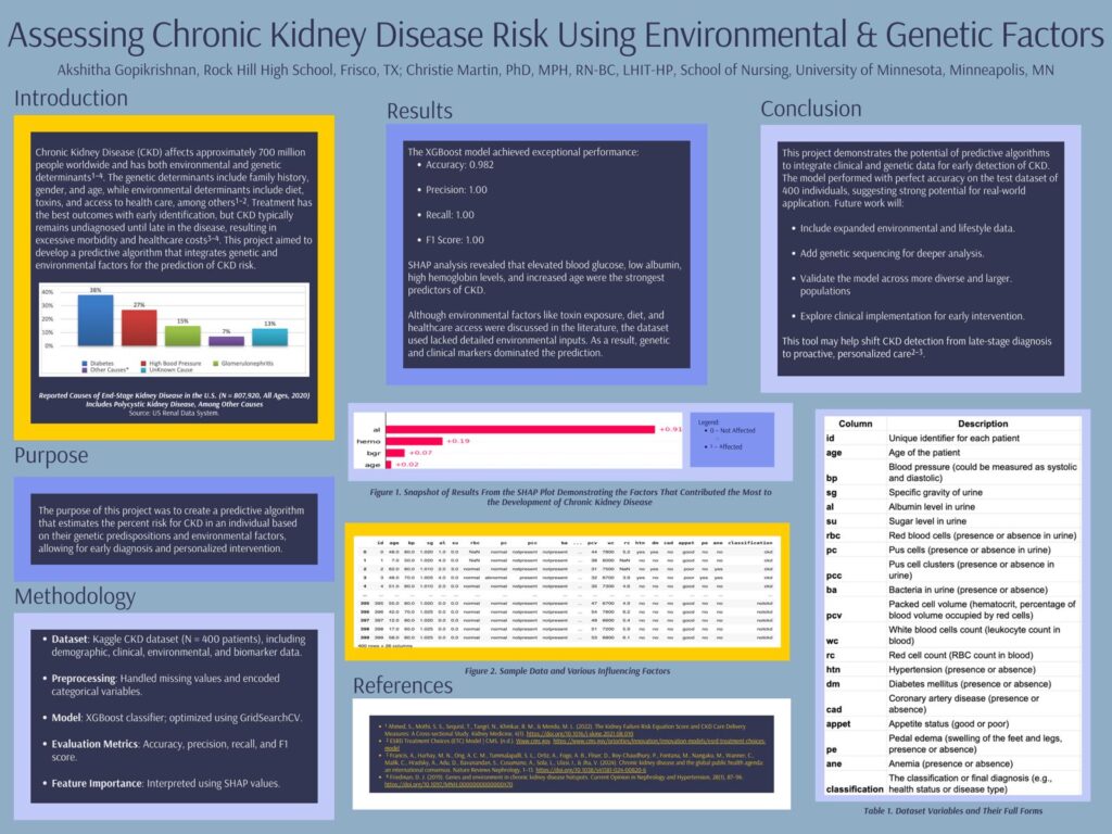 Genetic Risk Factors for Kidney Disease: A Statistical Approach to Early Detection” – Accepted: First high school presenter to be at the Undergraduate level at AMIA 2025 Annual Symposium – Nov 2025, sharing research on effective CKD early detection methods to improve patient outcomes among health professionals.Nov 2025.