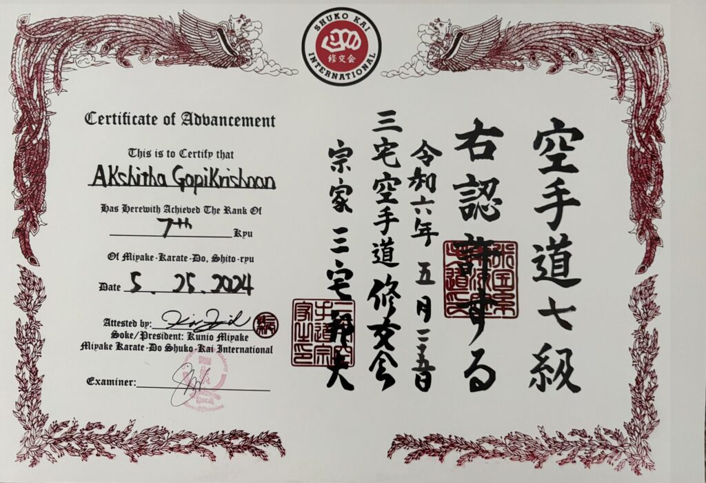 2nd Place at the All-India Martial Arts Academy for Kumite. 2nd Place at the Miya-Kalia Cup International Karate Tournament 2024. USA Karate: Active member of the CKA, for the National Karate Championship in June 2025.(Aug 2020 – Present)
